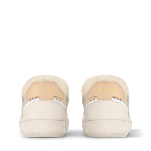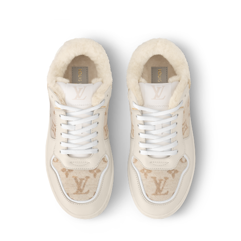 The LV Stadium sneaker is revisited in a winter-ready version in soft Monogram cashgora wool with a fluffy shearling lining. Coordinating calf-leather trim adds to the refinement of this design, which comes on a lightweight rubber outsole. The back of the sneaker is trimmed with natural leather and embossed with the Louis Vuitton signature.