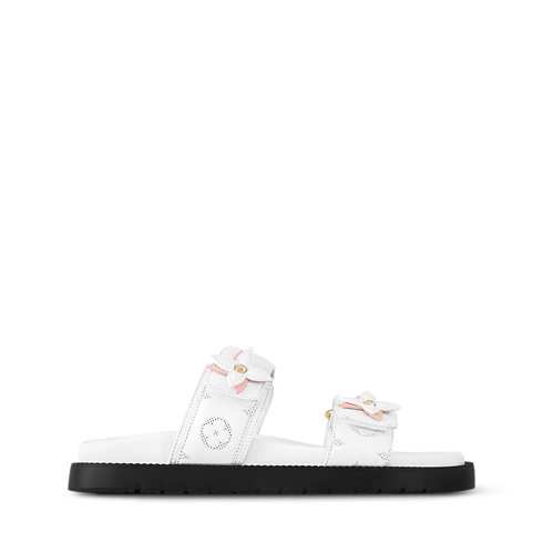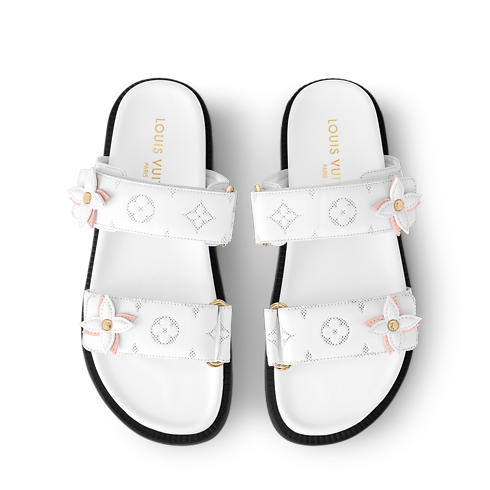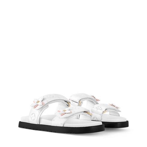 The edition of the LV Sunset flat comfort mule is part of the Summer Holiday collection. Its two adjustable velcro straps come in soft calf leather, which is delicately perforated with the Monogram pattern. The straps are embellished with leather Monogram Flower accessories, which bring a sophisticated twist to this relaxed style.