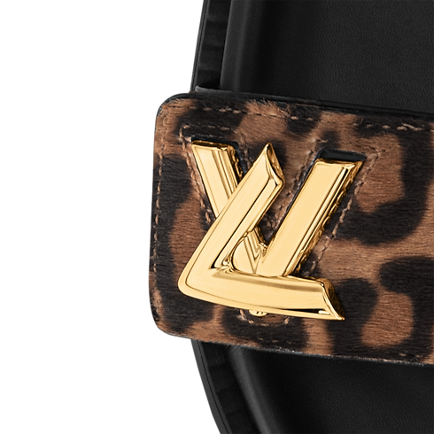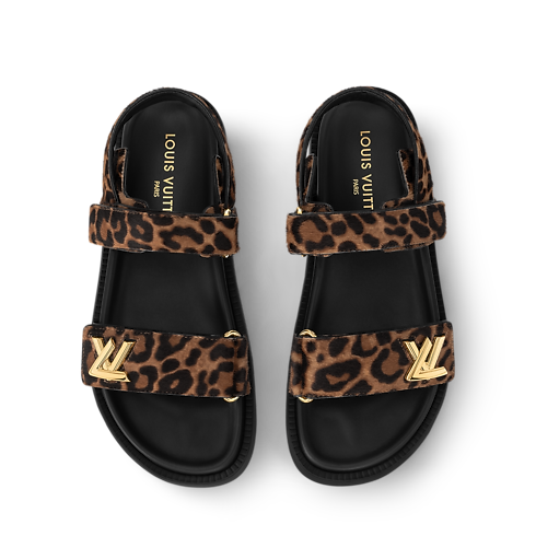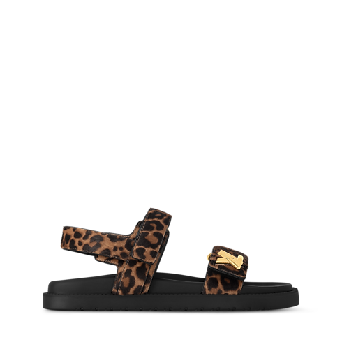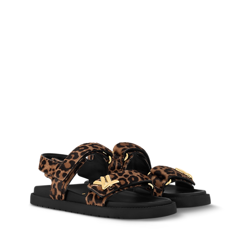 The LV Sunset flat comfort sandal is revisited this season in hairy calf leather printed with a leopard motif. It brings a touch of glamour to this easy-to-wear style, which features two velcro straps, a comfortable anatomic insole and a lightweight micro outsole. The front strap is signed with a gold-tone LV Twist accessory.