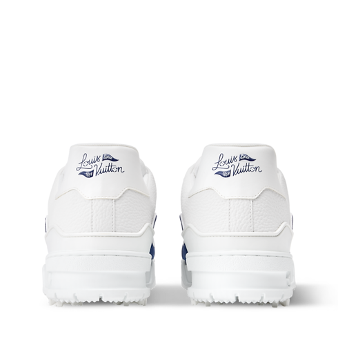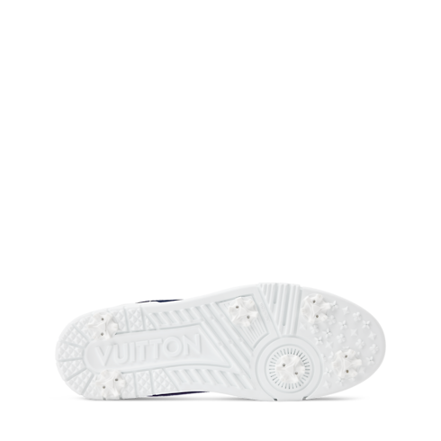 The iconic LV Trainer sneaker is adapted for golf with an upper in water-resistant, leather-like textile and an outsole with removable, technical spikes. The sporty, two-tone color palette coordinates with the Louis Vuitton Golf collection, whose signature appears on the back. Other key details are rubber LV Initials and Louis Vuitton in gold-toned script on the side.