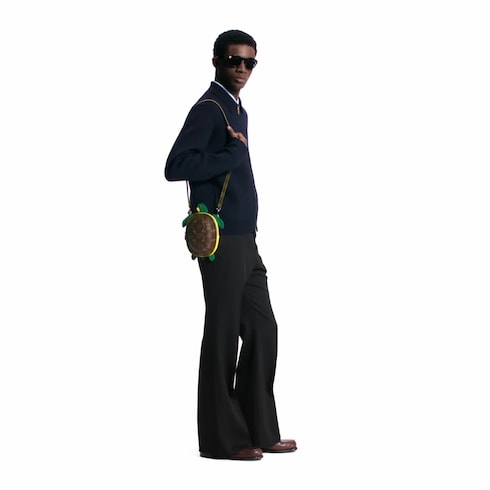 The LV Turtle Wearable Wallet, featuring a Monogram shell and green-and-yellow leather turtle, is a Pharrell Williams favorite. Sized just right for a phone, this cross-body bag channels his casual aesthetic. A removable, adjustable strap adds versatility, making it a fun and functional statement piece.