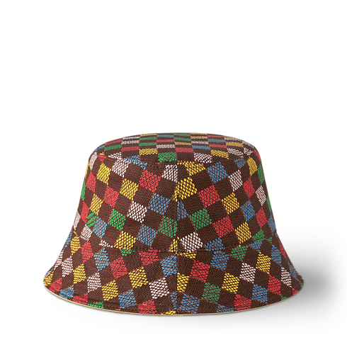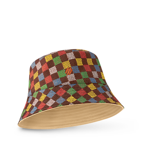 The LV Vers Damier Reversible Bucket Hat is a lively style that introduces the new multicolored pattern that combines the classic Damier print with LV Vers, a recent addition to the repertoire from Pharrell Williams. On the checkered side is another hallmark from Williams, the Marque L.Vuitton Déposée signature, and on the solid side, the LV Vers United signature.
