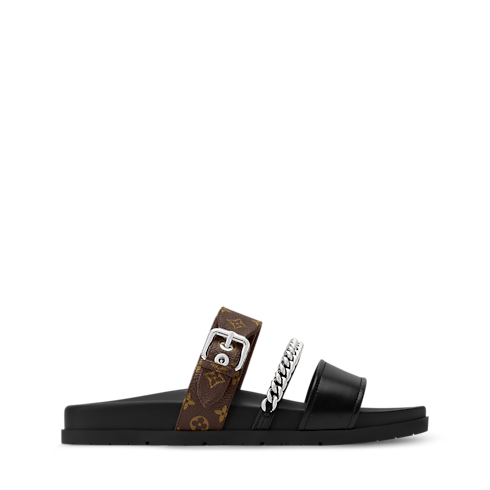 The LV Vibe comfort mule is a relaxed yet refined style combining soft lamb leather with Monogram canvas. It is distinguished by its three different straps, the middle one featuring a chunky, decorative chain in silver-toned metal. This model has a comfortable anatomic footbed and a lightweight rubber outsole.