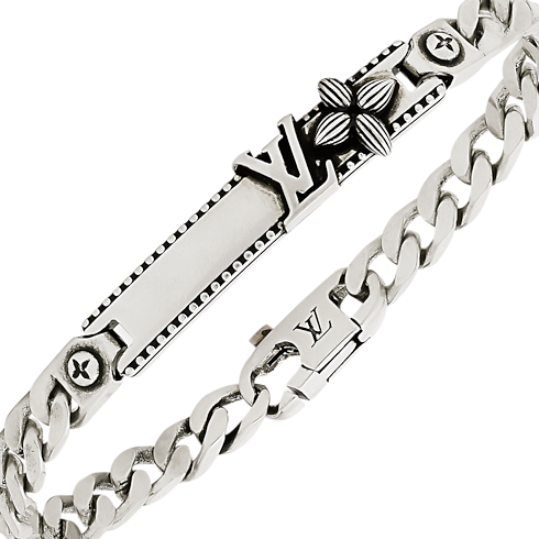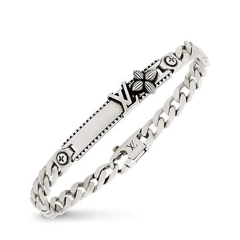 The LV Whisper Gourmette bracelet is a cutting-edge adaptation of the classic ID plate look. Complete with plaited links and an engraved clasp, the style is studded with a pair of LV Initials and a single Monogram Flower. The outcome is an easygoing piece that captivates on its own or stylishly stacks with additional bracelets.