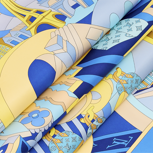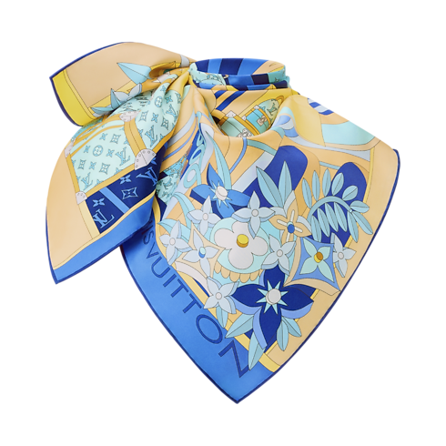 Innovation meets imagination in the artistic pattern of the LV Wonderland square. Printed on sumptuous silk, it depicts a playful, futuristic landscape of blooming Monogram Flowers combined with iconic Louis Vuitton trunks and bags, plus a House signature in dynamic 3D-effect lettering. With its radiant colors and eye-catching contrasts, this versatile accessory makes a bold creative statement.