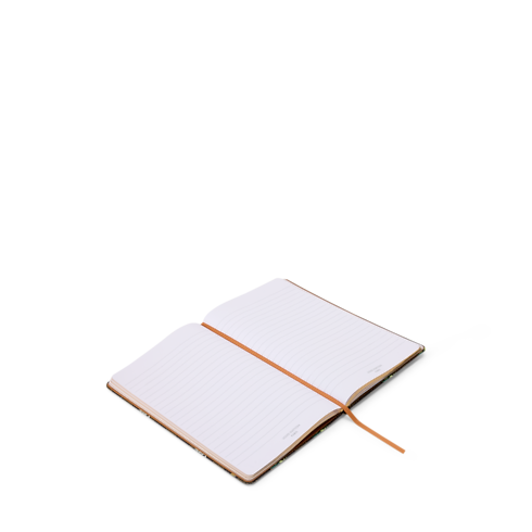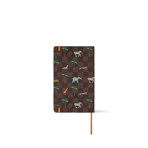 The Louis Vuitton x The Darjeeling Limited Jane notebook sports an attractive cover that is purely original. The brown checkered pattern is dotted with illustrations of wild animals and palm trees, from the season's collection inspired by the colorfully vibrant film. A white "L.V." is centered on the front of the cover, and a vivid orange strap of elastic keeps the pages intact.