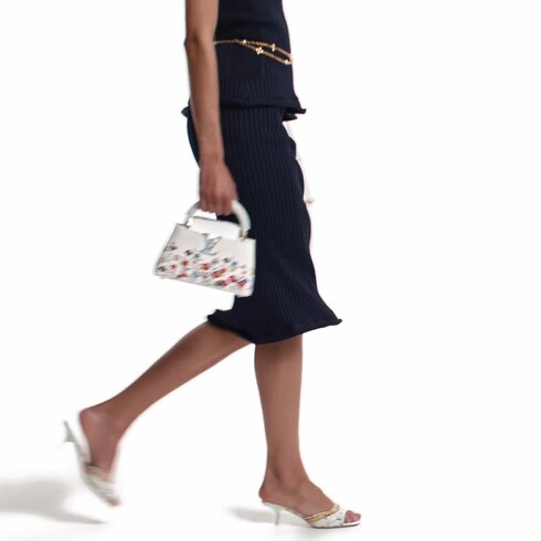 The Capucines East-West Mini is playfully reimagined as part of the re-edition of the Louis Vuitton x Murakami collection to make an elegant statement. Printed and emobossed on cowhide leather, the House’s iconic Monogram Flowers are vibrantly reimagined in the Japanese artist’s vernacular superflat style, while a fresh blue shade adds a pop of color to the iconic LV Initials and removable braided strap.