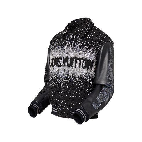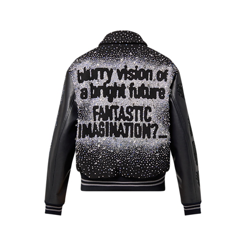 This Made to Order varsity blouson from the FW23 Show is encrusted with hand-embroidered crystals and beads. Crafted from black wool and leather, this piece features Louis Vuitton signatures and Show slogans on the chest, back and arms, making this piece truly exceptional.