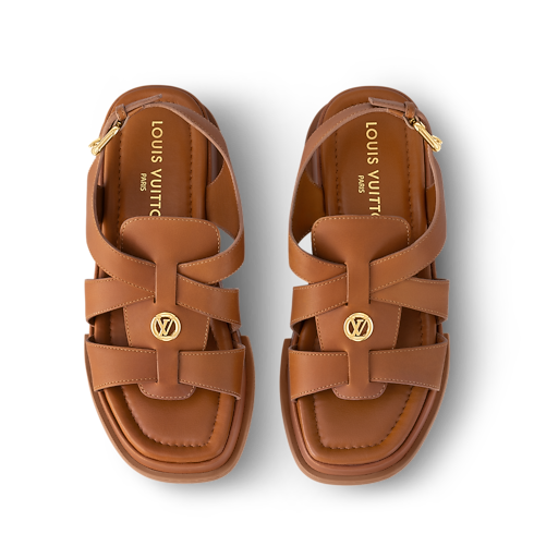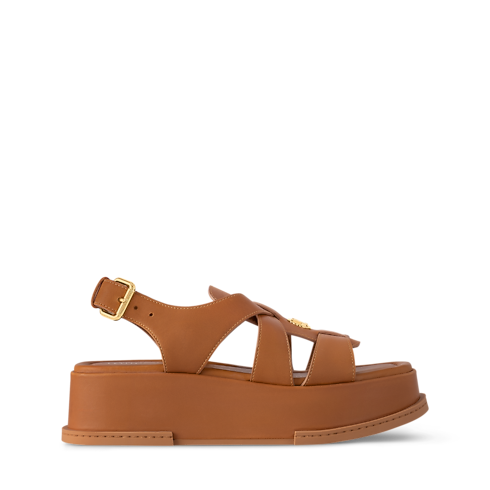 The Maya flatform sandal is an on-trend style crafted from smooth calf leather. On the upper, wide straps are threaded through a leather tongue, which is embellished with a gold-tone LV Circle accessory. The chunky yet lightweight platform is also covered in leather, while the rubber outsole is color-matched to the upper for a refined look.
