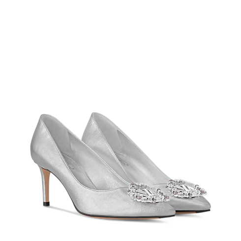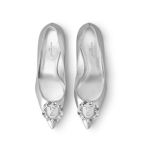 The Met pump is an elegant, evening-ready style crafted from metallic calf leather. Its pointed toe is embellished with a jewel-like accessory in silver-toned metal, on which the LV Initials are surrounded by pearls and rhinestones, some in the shape of Monogram Flowers. This model is finished with a feminine, mid-height heel.
