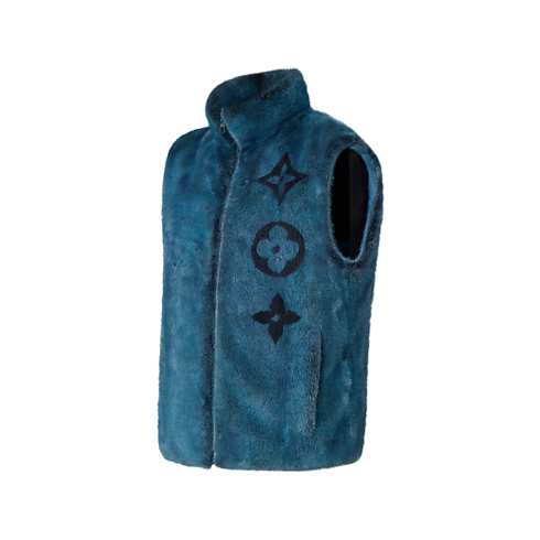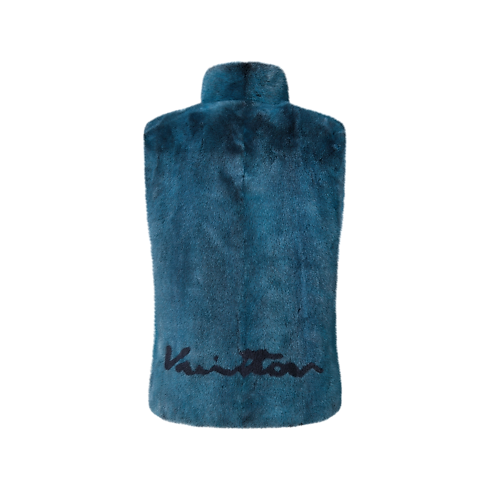 This luxuriously soft mink fur gilet is in a deep blue hue inspired by the ethereal tones of the aurora borealis from this collection. It is embellished with a contrasting black intarsia Monogram flower on the chest and a Vuitton signature at the back. Effortless yet sophisticated, it offers a distinctive winter layering option.