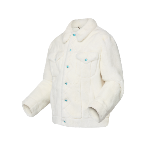 This exclusive white mink jacket from the FW24 Show spotlights the creative exchange between the collection’s Western inspirations and the Louis Vuitton savoir-faire. Cut with a classic denim trucker silhouette, the soft, deep fur is embellished with turquoise buttons and a hand-embroidered LV signature in resin pearls across the back. This sophisticated piece elevates both casual and evening looks.