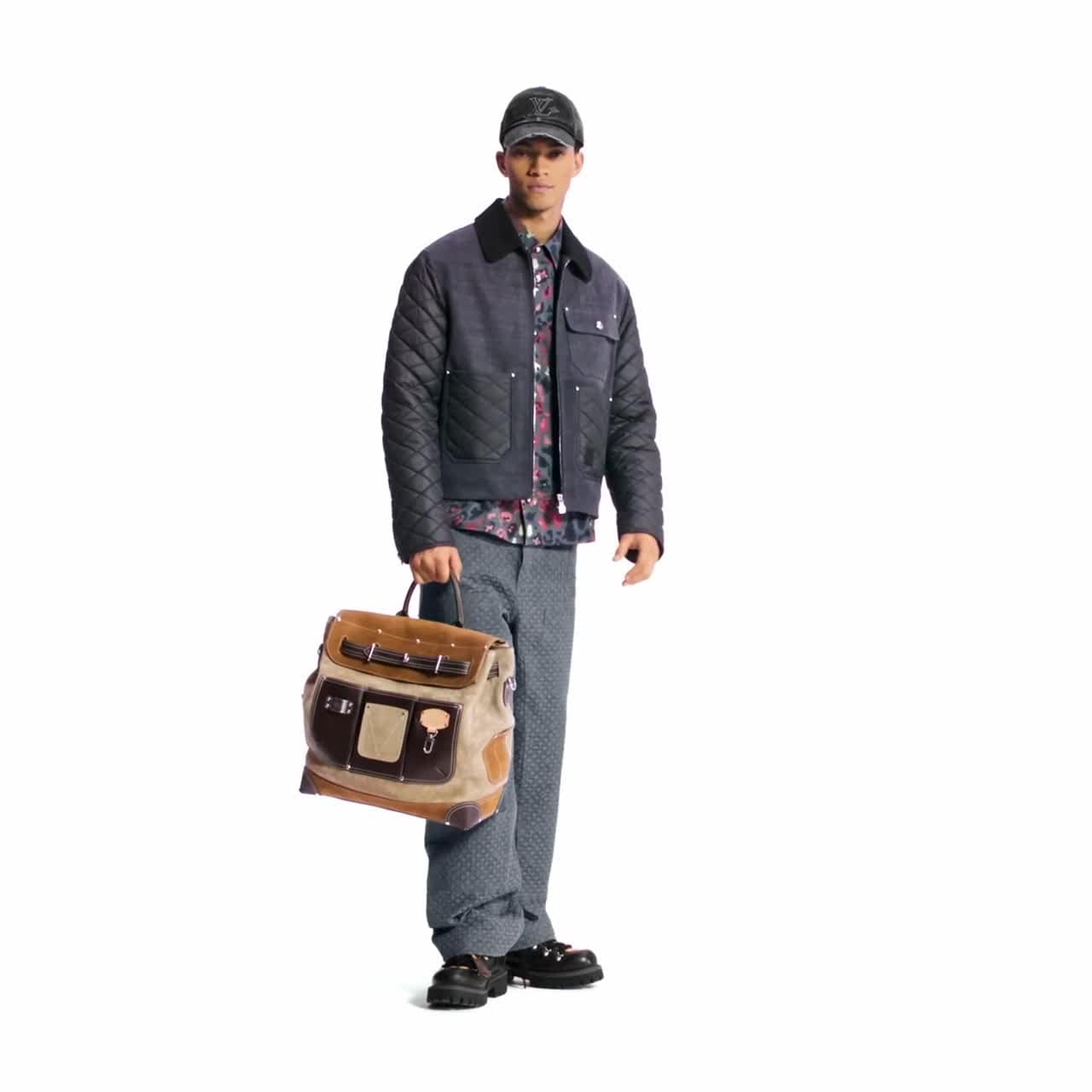 This dark gray workwear-inspired blouson is rich in considered details. The calfskin body is crafted with a trompe l’oeil linen effect while the nylon sleeves, patch pockets and lining are lightly quilted with a diamond pattern recalling the interiors of Louis Vuitton trunks. A black leather Marque L.Vuitton Déposée patch signs the bottom left pocket, while silvery rivets lend a chic finishing touch.