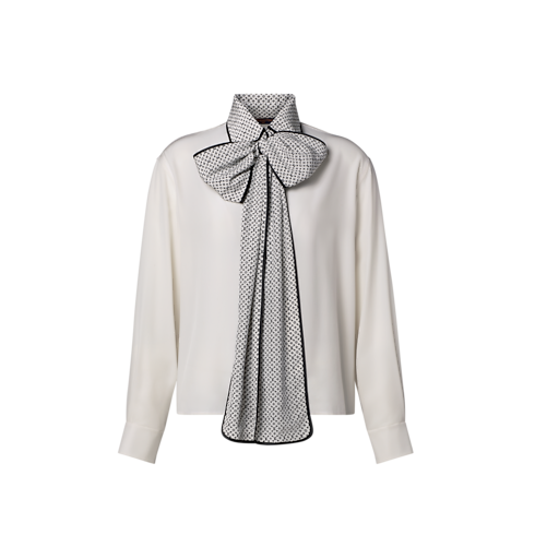 This blouse is crafted from fluid silk crepe de chine in a subtle shade that is offset by contrasting stitching around the cuffs and the graphic two-tone mini Monogram motif that highlights the rounded collar and voluminous lavallière neck ties. It is tailored in a comfortable straight shape for sophisticated styling.