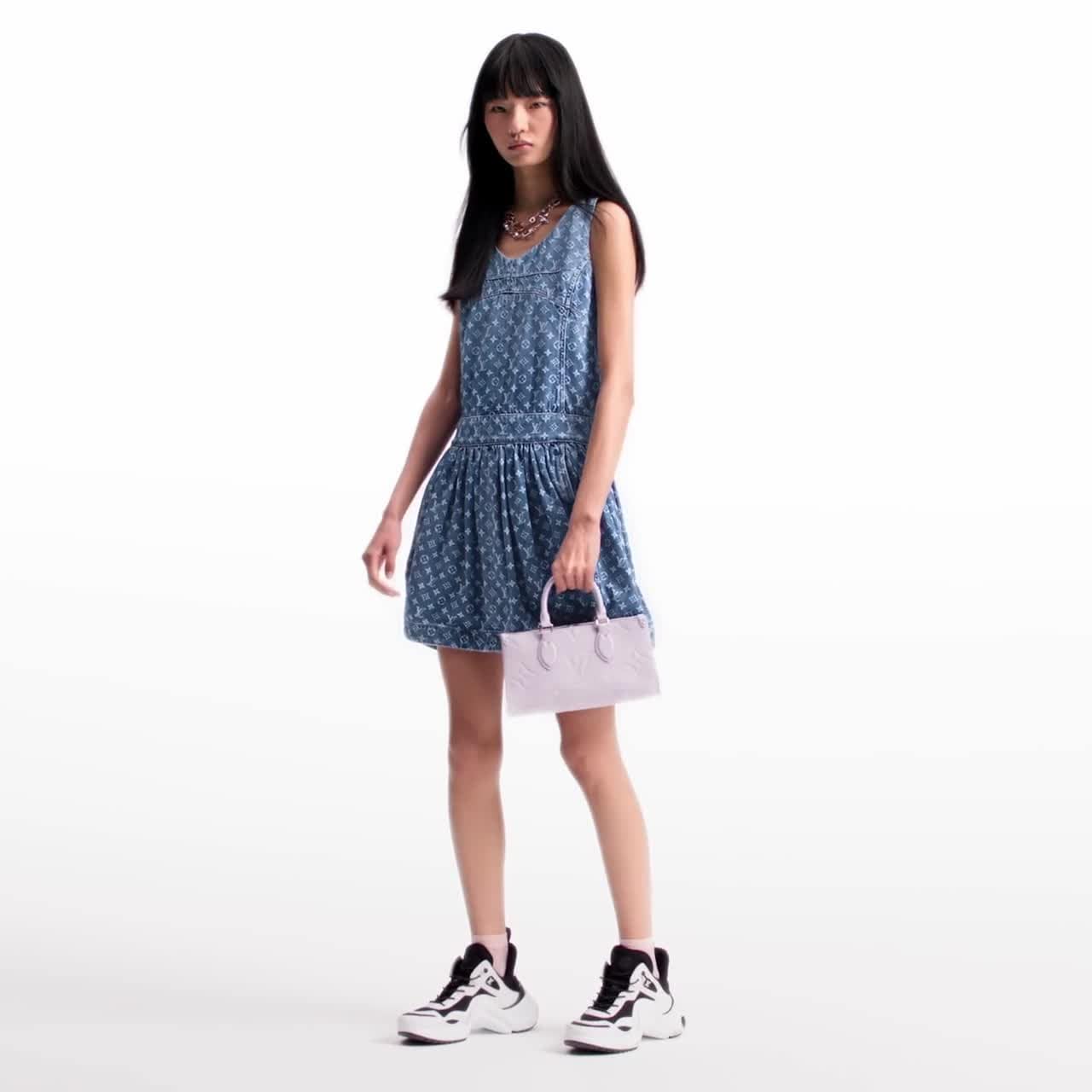 This dress has spirited everyday appeal in this season’s soft, lightweight denim featuring an allover Monogram print. Contrasting yellow topstitching adds structure around the bust, while gathering around the waist forms a voluminous bubble skirt. An exposed zipper fastening adds a modern sporty touch to the back.