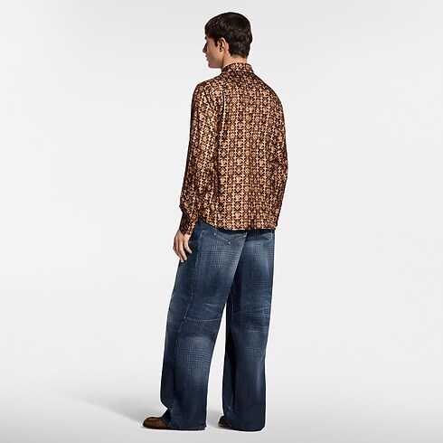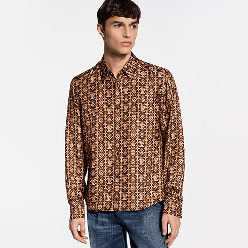 This fluid shirt is crafted from pure organic silk in rich brown Louis Vuitton heritage tones. It features a graphic allover Monogram Overlap motif from the Spring-Summer 2026 show and is finished with lustrous tiger’s eye quartz-like buttons. This luxurious piece brings an elevated signature accent to a look.