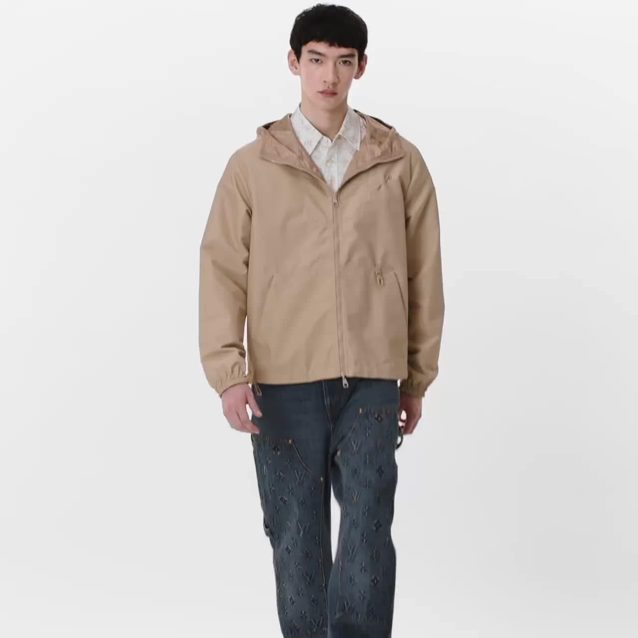 Made from water repellent technical fabric, this elegant reversible windbreaker has a plain matt side embellished with a carabiner and a pin signature on the left chest, while the other side features an allover tonal Monogram jacquard. This versatile piece for changeable weather is easy to wear and match, making it a perfect addition to any wardrobe.