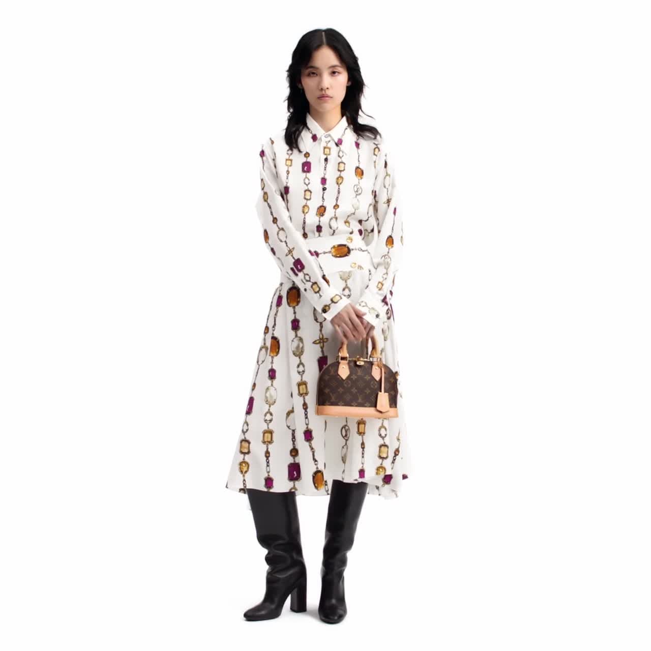 This skirt projects modern elegance in airy silk crepe de chine cut in a versatile mid-length silhouette with pleats to emphasize the fluidity of the fabric. This season’s signature necklace motif features as a playful allover print, while the wide waistband is trimmed with hammered golden buttons for a chic double-breasted effect.
