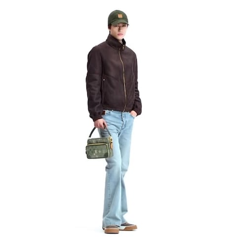 The vintage-inspired Nil cross-body bag is made from Monogram Surplus coated canvas, featuring an irregular Monogram motif over a khaki-green base. Aged-gold-tone hardware and touches of tan leather elevate the design. It includes a removable top handle and a wide, adjustable shoulder strap for versatile styling.