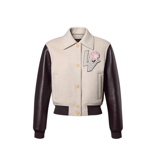 Revisiting a timeless varsity look, this jacket is elevated in a plush double-face wool-silk blend with contrasting sleeves in lambskin leather for a refined finish. The chest and back are embellished with seasonal Louis Vuitton patches that nod to the House’s Art Nouveau heritage, while gold-toned snap buttons and a graphic ribbed waistband underscore the sporty style.