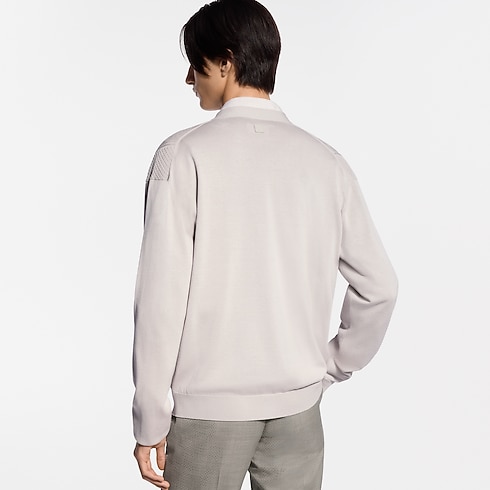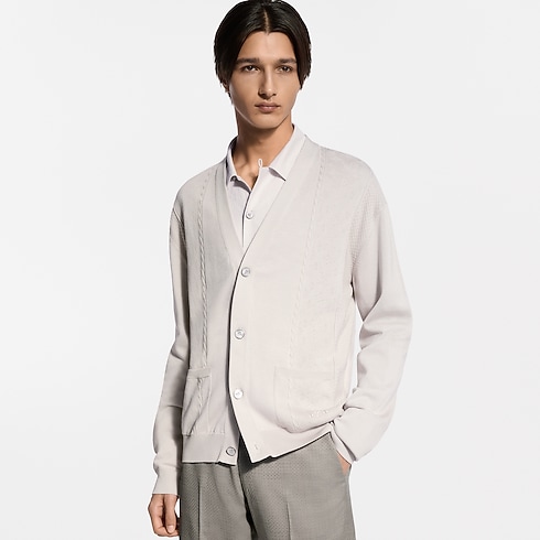 This elegant ivory cardigan is a versatile layering piece in the modern formal wardrobe. Crafted from a lustrous cotton-silk blend, it features a light and airy pointelle knit incorporating tone-on-tone bands of Monogram and Damier signatures. Combining comfort with preppy elegance, it can be worn with a suit or styled with smart chinos for a refined and contemporary look.