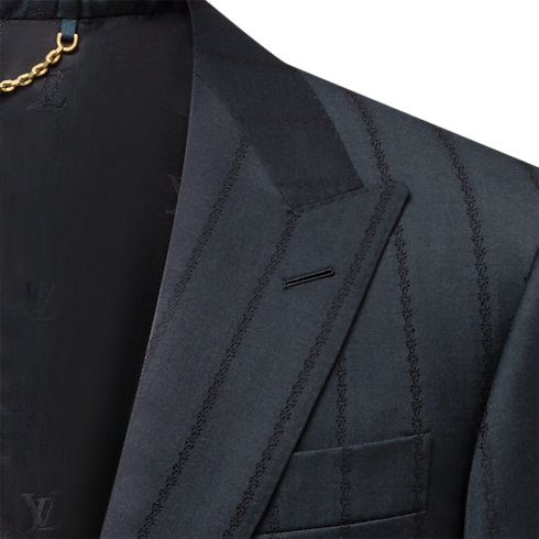 This sleek single-breasted Pont Neuf jacket plays with the codes of tailoring by reinventing the classic pinstripe motif, which is reconfigured here as a string of miniature LV signatures integrated into an LV Stripes jacquard. Crafted from fine wool in an elegant navy blue, this flattering piece makes a chic formal suit paired with matching cigarette pants.