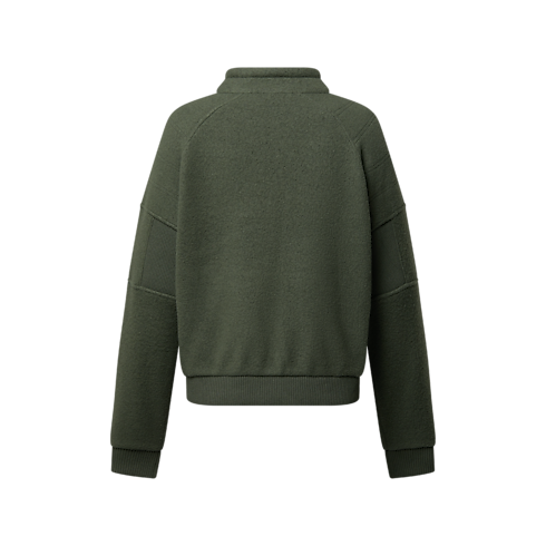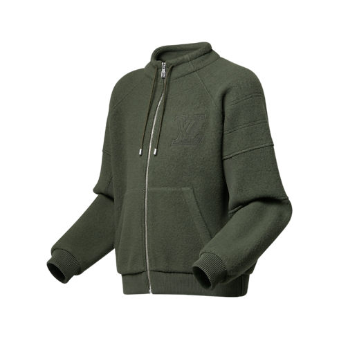 Casual yet elegant, this loungewear-inspired blouson is perfect for traveling, crafted from warm, softly textured wool fleece in timeless olive green tones. The sporty tailoring features a tall, drawstring-adjusted collar and raglan sleeves with ribbed elbows for ease of movement. Topstitching creates a smart, quilted effect with an embroidered LV on the chest. Matching pants make a cosy set.