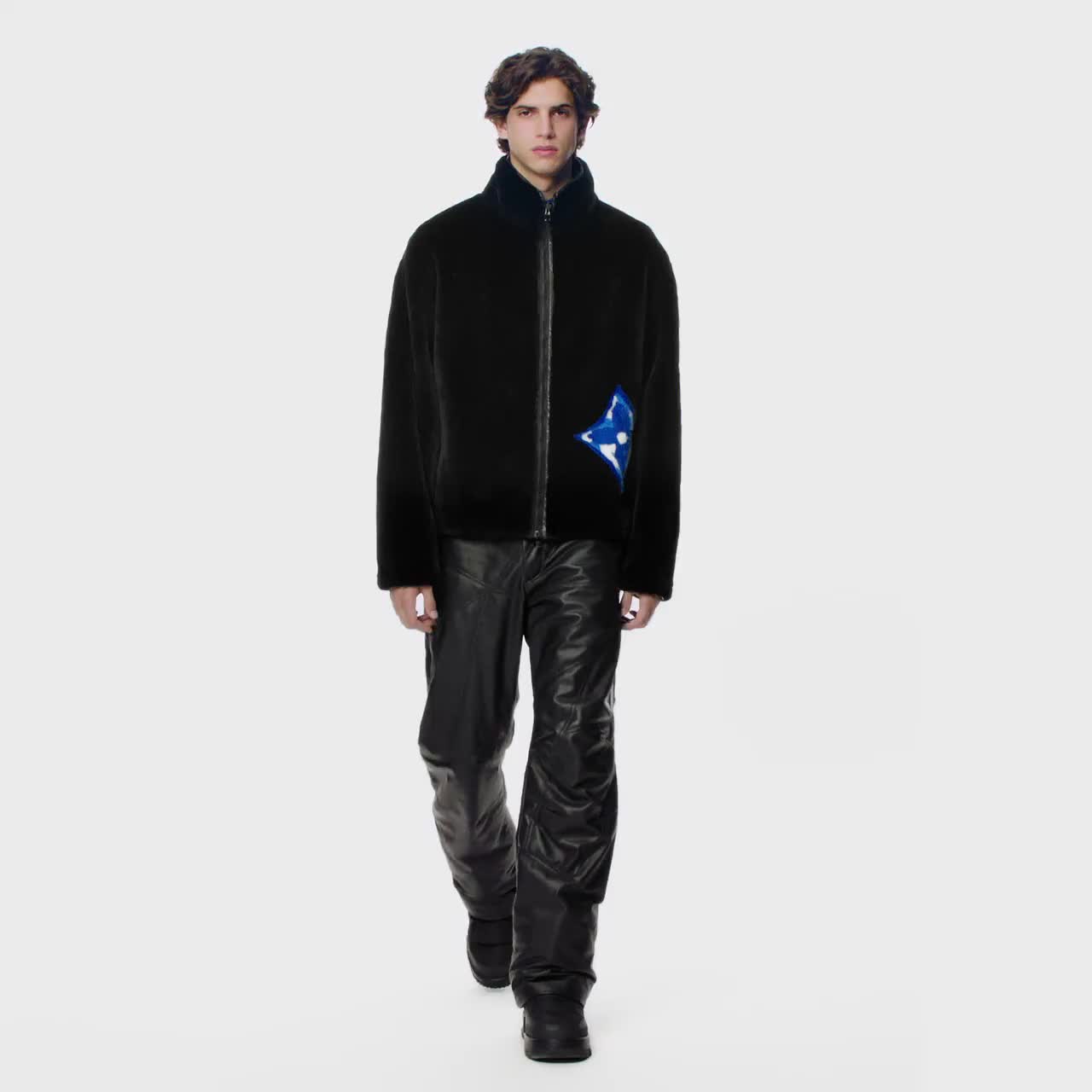 This exclusive mink blouson from the Ski Capsule is fully reversible. The luxuriously soft, deep black fur is embellished with sophisticated contrasting intarsia LV Ice signatures in frosty blue and white, while the technical nylon side, printed with a graphic allover LV Ice motif, enhances the sporty silhouette. This standout piece is perfect for festive after ski moments.