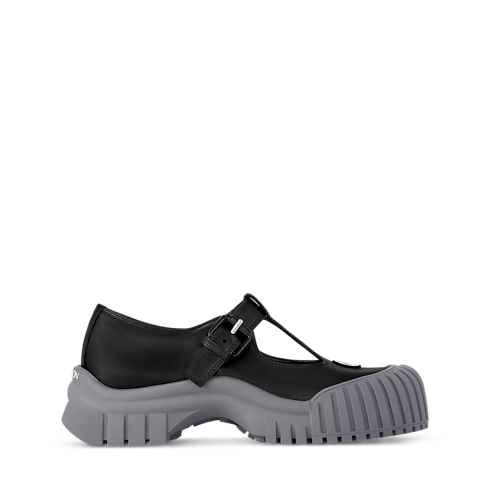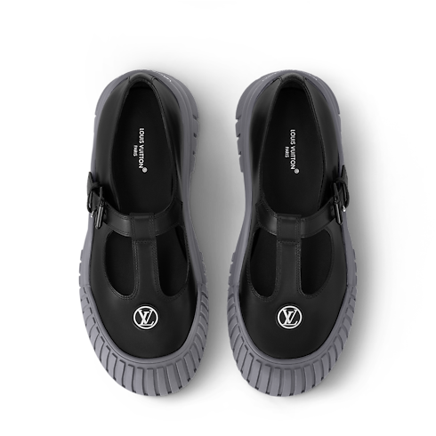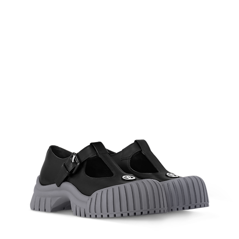 The Ruby flat Mary Jane is revisited this season in a two-tone version, with a contrast between the upper in matte calf leather and the rubber outsole. The chunky outsole, with its distinctive vertical ridges, is a key feature of this fashion-forward style. The front of the shoe is signed with a rubber LV Circle.