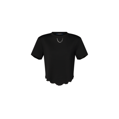 Scalloped edges rework this staple T-shirt with a playful, modern spirit for elevated everyday styling. It is made from soft cotton jersey in a straight-cut, cropped shape with a rounded hem. The crew neckline is trimmed with an LV chain detail for a chic signature finish.