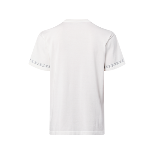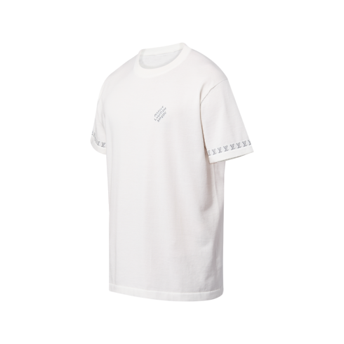 This smart white short-sleeved crewneck in a fine organic cotton knit is crafted with delicate contrasting jacquard signatures. These include a discreet ‘Marque L.Vuitton déposée’ on the chest and a band of LVs around the cuffs creating a neat graphic effect. This versatile piece brings a distinguished touch to everyday looks.