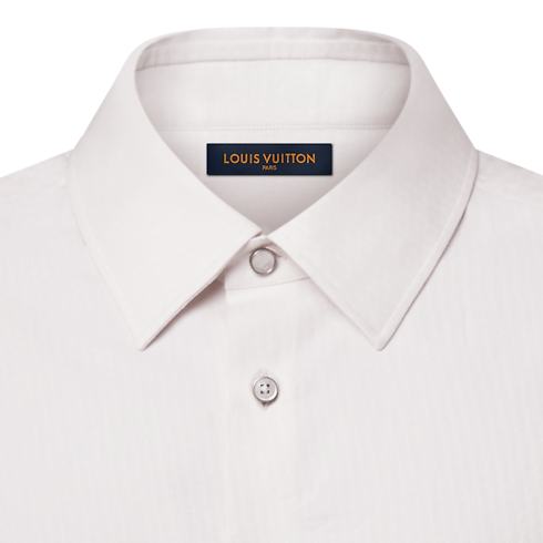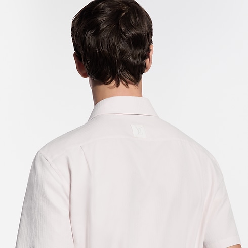 This ivory-toned short-sleeved shirt is a fresh option for warmer days. The fine, organic cotton is adorned with a jacquard LV Interlocked motif. Additional signature details include an LV button on the collar and woven signature labels on the button placket and the back. This piece can be paired with a suit in the same motif.