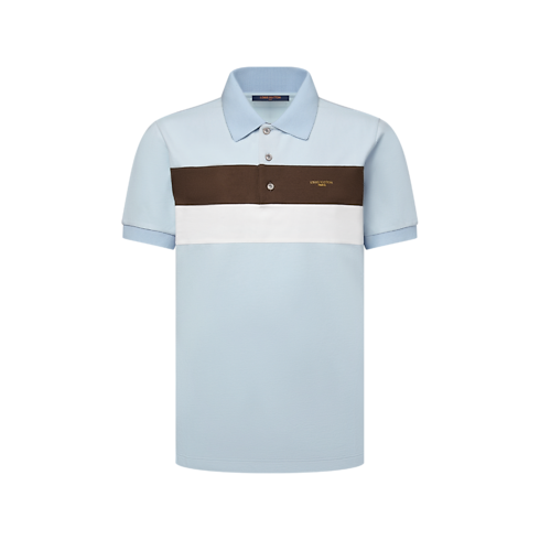 This refined polo shirt is crafted from pale blue cotton piqué with contrasting horizontal brown and white bands across the torso. A gold-stamped Louis Vuitton Paris signature adds a sophisticated accent to the chest while a leather Marque L.Vuitton Déposée patch signs the back of this preppy style.