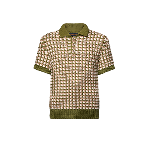 This runway piece from the Spring-Summer 2026 show revisits the classic polo shirt. Crafted in a chunky wool knit, it features a graphic LV Stitch motif in elegant green and beige tones and is finished with a leather signature patch on the back. A layering piece, it can be styled over a shirt for a refined play of color and texture.