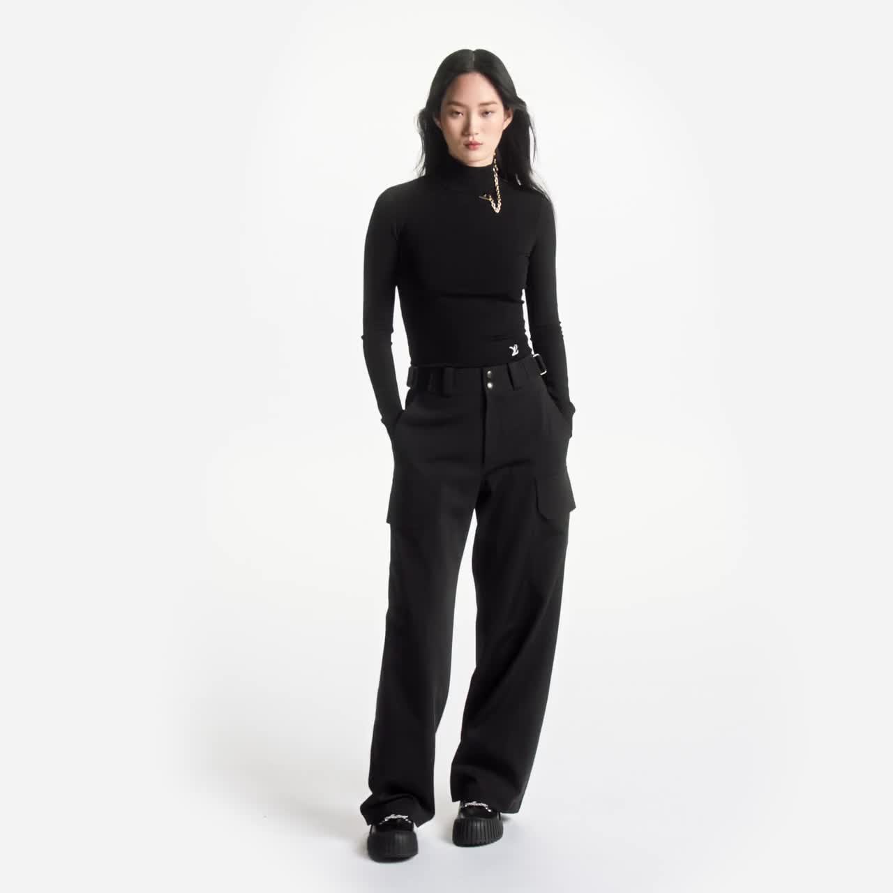 A closet staple with a statement twist: this turtleneck sweater is elevated with an asymmetric exposed golden zipper pulled with a coordinating chain that drapes elegantly around the collar. Crafted from a silky stretch knit in a comfortable second-skin fit. Contrast LV Initials sign the look.