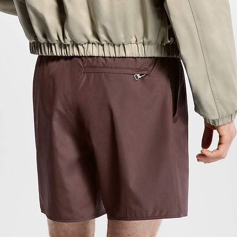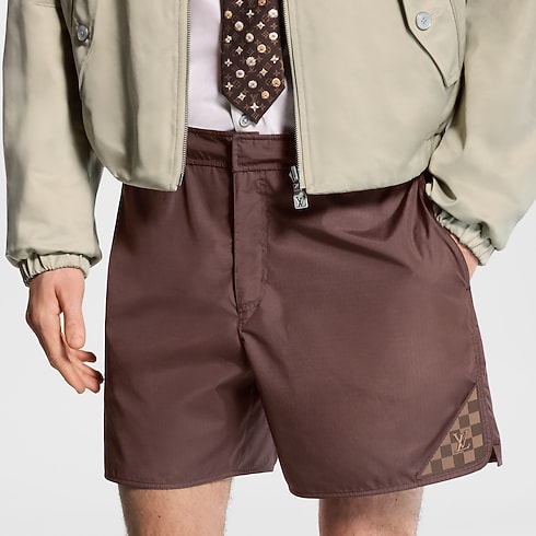 These dark brown swim shorts in technical ripstop fabric bring an elegant mood to the pool. Their minimalist silhouette is adorned with a silicone Damier Heritage patch incorporating 3D LV lettering on the left leg. With their Italian pockets and a zipper fastening, these shorts can also be styled out of the water with casual and sporty separates.