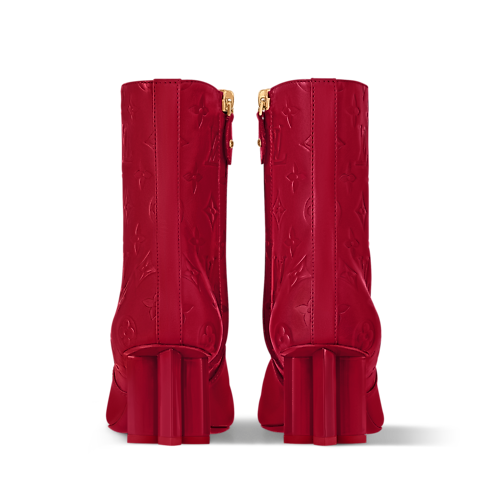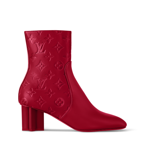 One of the icons of the Louis Vuitton shoe collection, the Silhouette ankle boot is reinterpreted this season with a lower heel height. It comes in supple calf leather, which is partially embossed with the Monogram pattern. Its lacquered Monogram Flower-shaped heel is matched to the upper for a refined look.