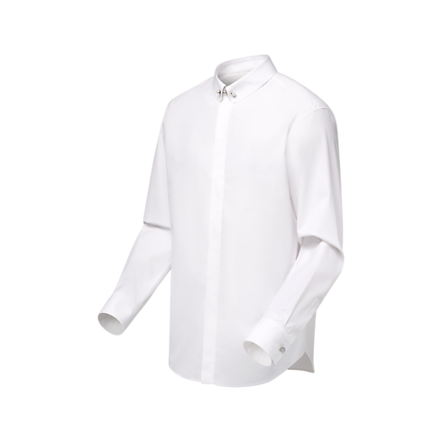 Crafted in a fine cotton-silk blend, this chic white shirt is perfect for completing an evening look. It has a concealed button placket and an elegant rounded collar fastened with a pearly signature brooch. Pearl-like buttons close the cuffs, while a woven signature label adorns the bottom of the placket and a Marque L.Vuitton Déposée label signs the back.