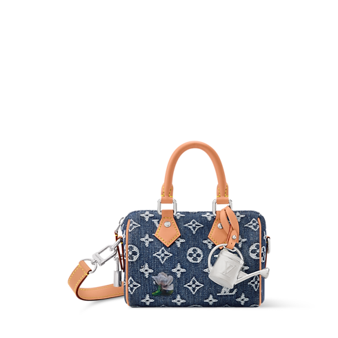 The smallest in the Speedy family, the compact Speedy 18 Bandoulière is made from Monogram Flowers Denim, accented with cowhide-leather trim and a metallic watering can charm. Its woven Monogram and subtle floral embroidery bring a fresh twist to classic lines. A detachable, adjustable strap allows both shoulder and cross-body carry.