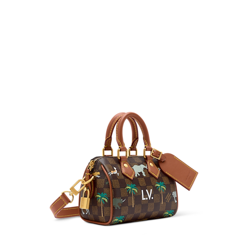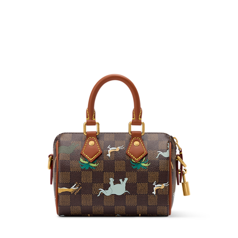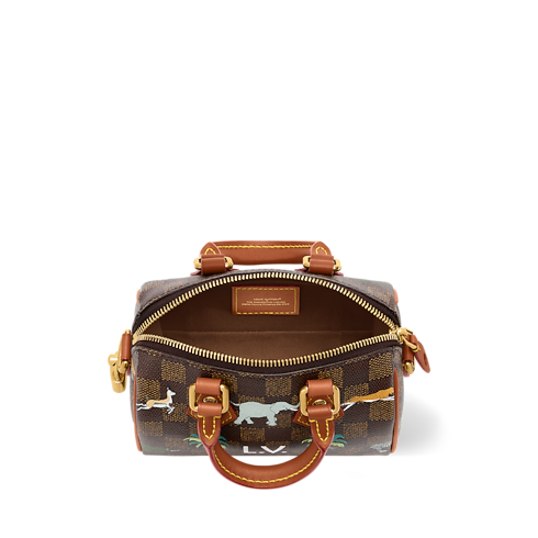As part of The Darjeeling Limited collection, the compact Speedy Bandoulière 18 is crafted from Damier Heritage coated canvas, animated with wild animals and palm trees and signed with bold L.V. initials. Lighter brown leather trim and gold-tone hardware underscore the bag’s classic Louis Vuitton design.