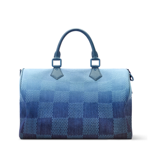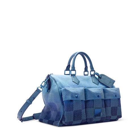 The Speedy Outdoor Bandoulière 40 is crafted from Damier Pigment Denim, its distinctive gradient achieved through an intricate process of bleaching and re-dyeing the jacquard. Defined by three front pockets with press studs, it features dual top handles, an additional longer handle, and a detachable, adjustable shoulder strap for versatile carry.