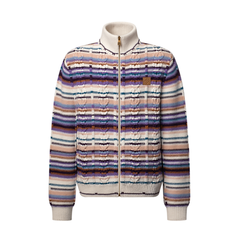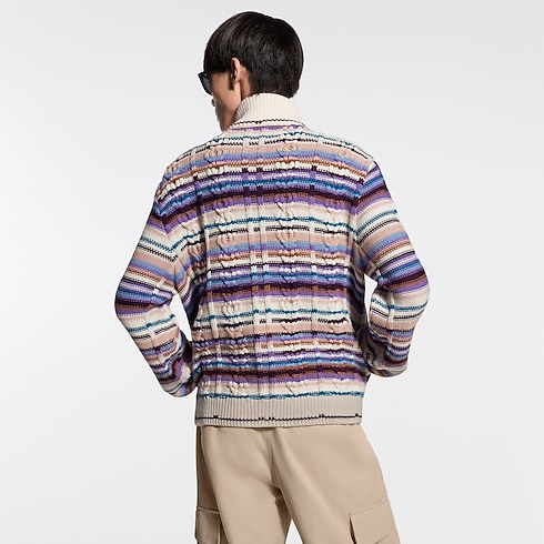 This luxurious wool-cashmere track top has a hand-crafted look, with colorful stripes incorporated into a textured cable-knit. Featuring a zipper fastening and a stand collar, it can be worn as both a cardigan or a light outer layer on warm spring days. A leather signature patch adds a smart finishing touch to the chest.
