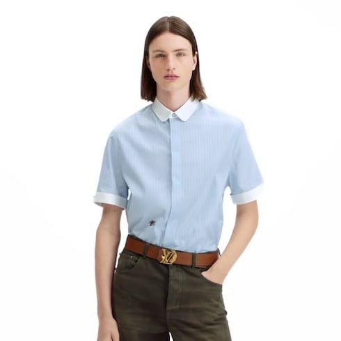 This short-sleeved shirt in smooth cotton poplin has an elegant pale blue striped motif. The rounded club collar and cuffs in contrasting white are perfectly suited to this season’s collarless jackets and cardigans. A playful embroidered LV Fox signature accents the lower right torso in a nod to this collection’s British countryside theme.