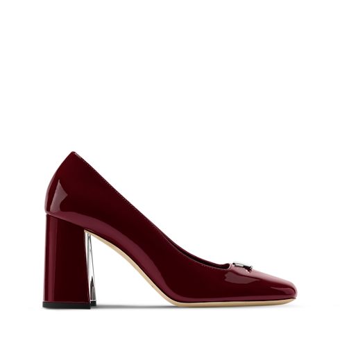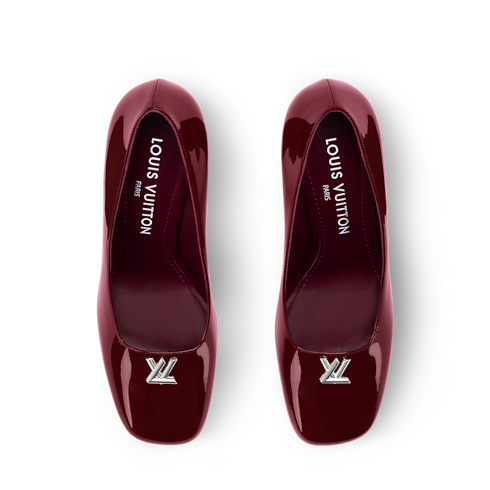 The Swing pump is an elegant style in high-shine patent calf leather. This model is distinguished by its square toe, which is signed with a silver-toned LV Twist accessory, and its high block heel, which has a striking half-flower shape. The interior of the heel is highlighted in metallic silver.