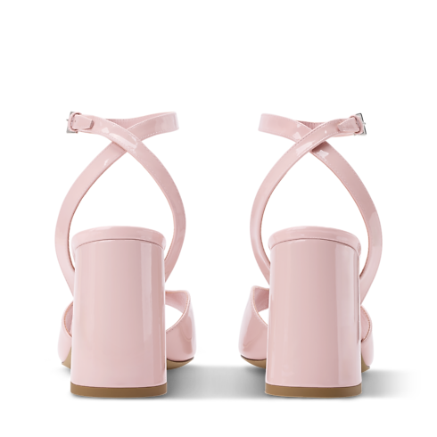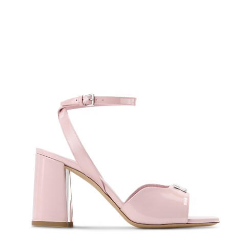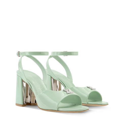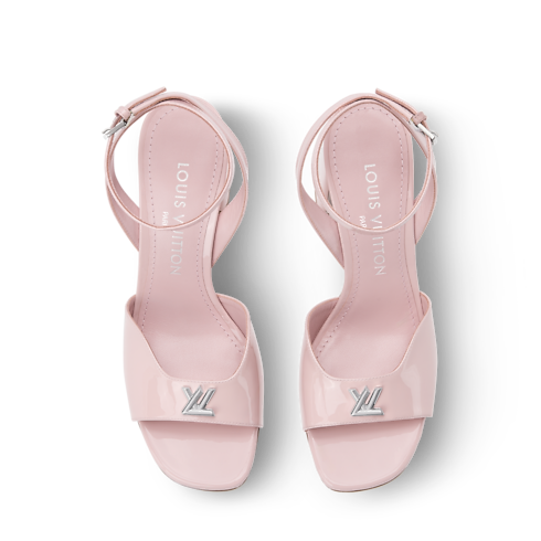 The Swing platform sandal is crafted from glossy patent calf leather. This elegant style is characterized by its rounded front strap with a silver-toned LV Twist accessory and its slender, buckled ankle strap. It comes on a high block heel with a distinctive half-flower shape, which is highlighted by a metallic interior.