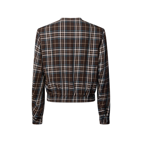 This light zippered blouson draws on the Spring-Summer 2026 show’s Indian Dandy inspiration with a sartorial plaid in rich brown tones and gold-toned Louis Vuitton Paris embroidery on the chest. The cropped silhouette with a ribbed finish to the cuffs and waist develops the iconic collarless jacket introduced by Pharrell Williams, bringing a relaxed and modern vibe to everyday looks.