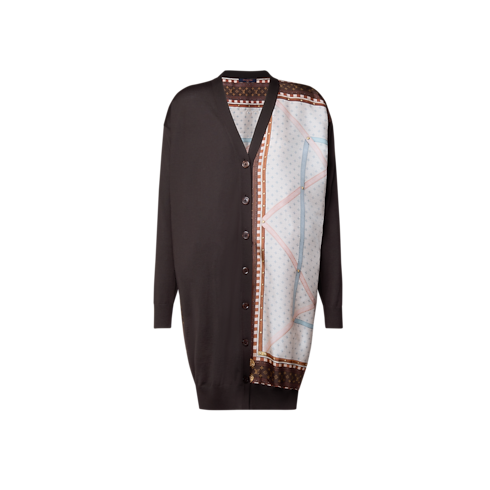 This cardigan subtly celebrates the House’s travel heritage with an elegant silk insert highlighting the left side that features a print of the inside of an archival Louis Vuitton trunk. It is crafted from a cozy wool knit in a long, loose fit that fastens to a V neckline.