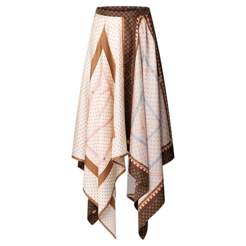This statement skirt from the runway collection is crafted from soft silk twill in a knee-length shape with a graphic handkerchief hemline for added volume and movement. It is printed with interiors of the House’s archival travel trunks, complete with Monogram borders for an iconic signature finish. Fastened at the back with an invisible zipper.