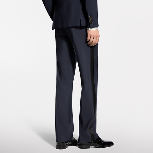These sharply tailored tuxedo pants have a flattering cigarette fit. They are cut from elegant navy blue grain de poudre wool with black satin bands on the outside of each leg and satin piped rear pockets. A woven LV label discreetly signs the back of the waist. A matching double-breasted jacket makes a poised and timeless evening set.