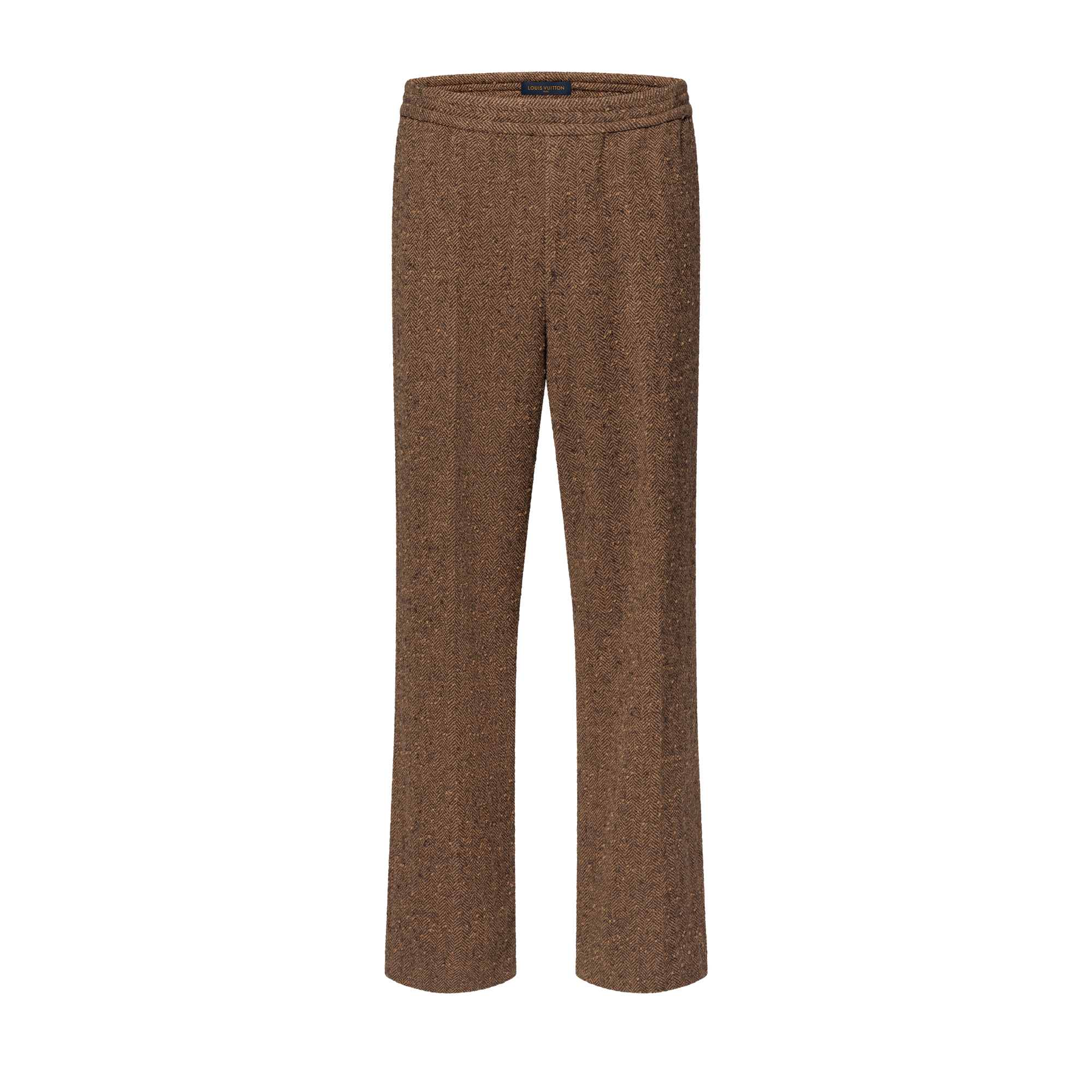 These drawstring pants twist the codes of tailoring, combining a comfortable elasticated waist with a herringbone wool tweed in rich brown tones. Their draped silhouette makes a versatile sartorial style adapted for modern life. A leather Marque L.Vuitton Déposée patch signs the back of this piece, which can be worn with a matching jacket for a comfortable and refined look.